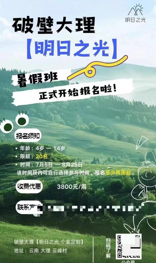 涉事夏令营机构名称叫做"明日之光",其公众号文章显示,该机构发起了一项"破壁者计划",称专门接收有自闭、发育迟缓、多动等特需问题儿童。与该夏令营同一位置显示的是一家名为"大理市湾桥镇破壁家政服务部"的个体工商户,经营范围为家政服务。